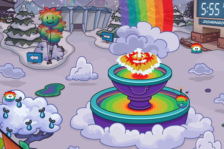 | De por si la única sala decorada es el fuerte nevado en la cual vemos una fuente del puffle arcoiris y alrededor de ella varios puffles de esta especie. Además en la parte inferior derecha de la pantalla hay un icono el cual si le damos clic accederemos a un catálogo. |